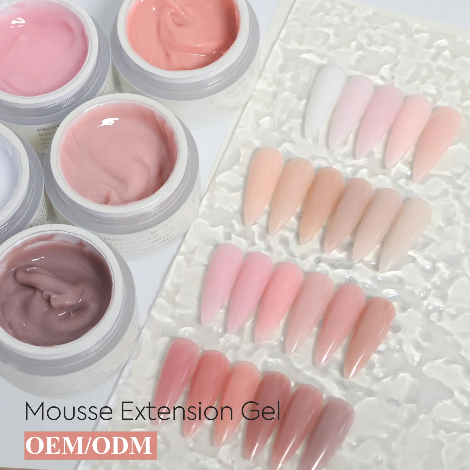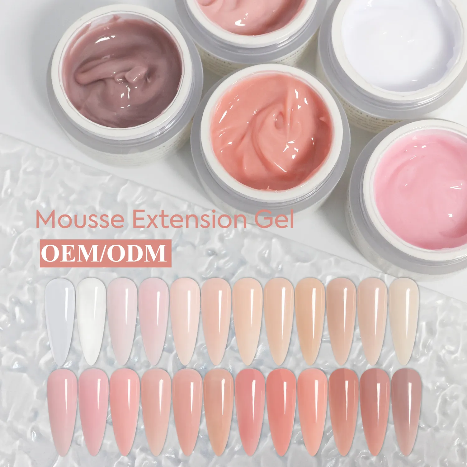 Welcome to purchase our 24 colors mousse extension gel wholesale featuring HEMA & TPO-Free formula and smooth extension performance. Factory-direct prices, low MOQ, free samples, and OEM/ODM services for nail brands.