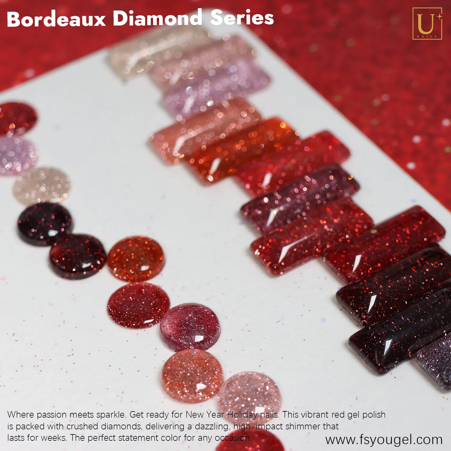 - Premium Bordeaux Diamond Shimmer Collection: 12 curated shades inspired by the Bordeaux red wine, delicate, luxurious diamond-like shimmer elevates the nail art with timeless elegance. One of the most popular color groups within the Bordeaux Diamond Gel Polish wholesale series.