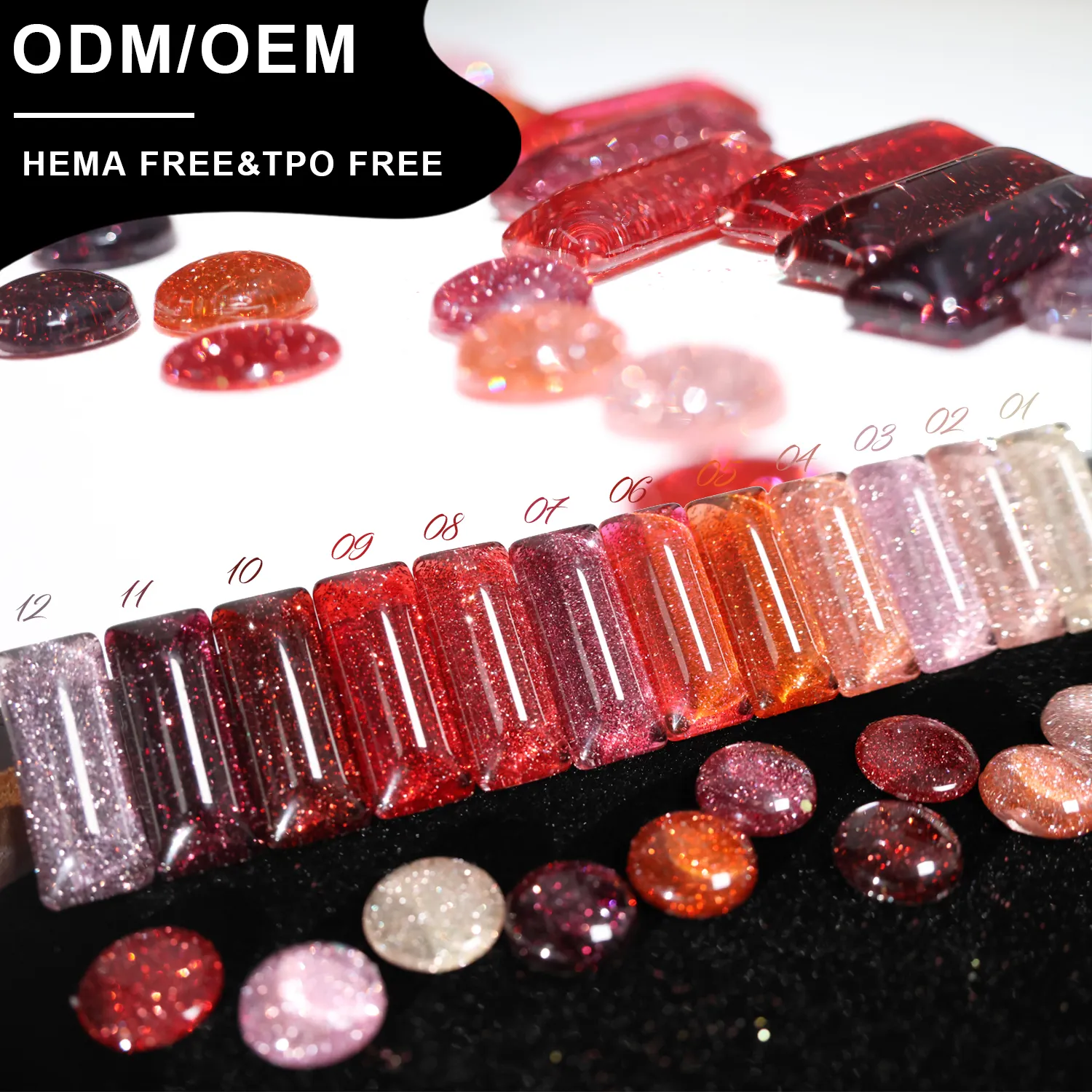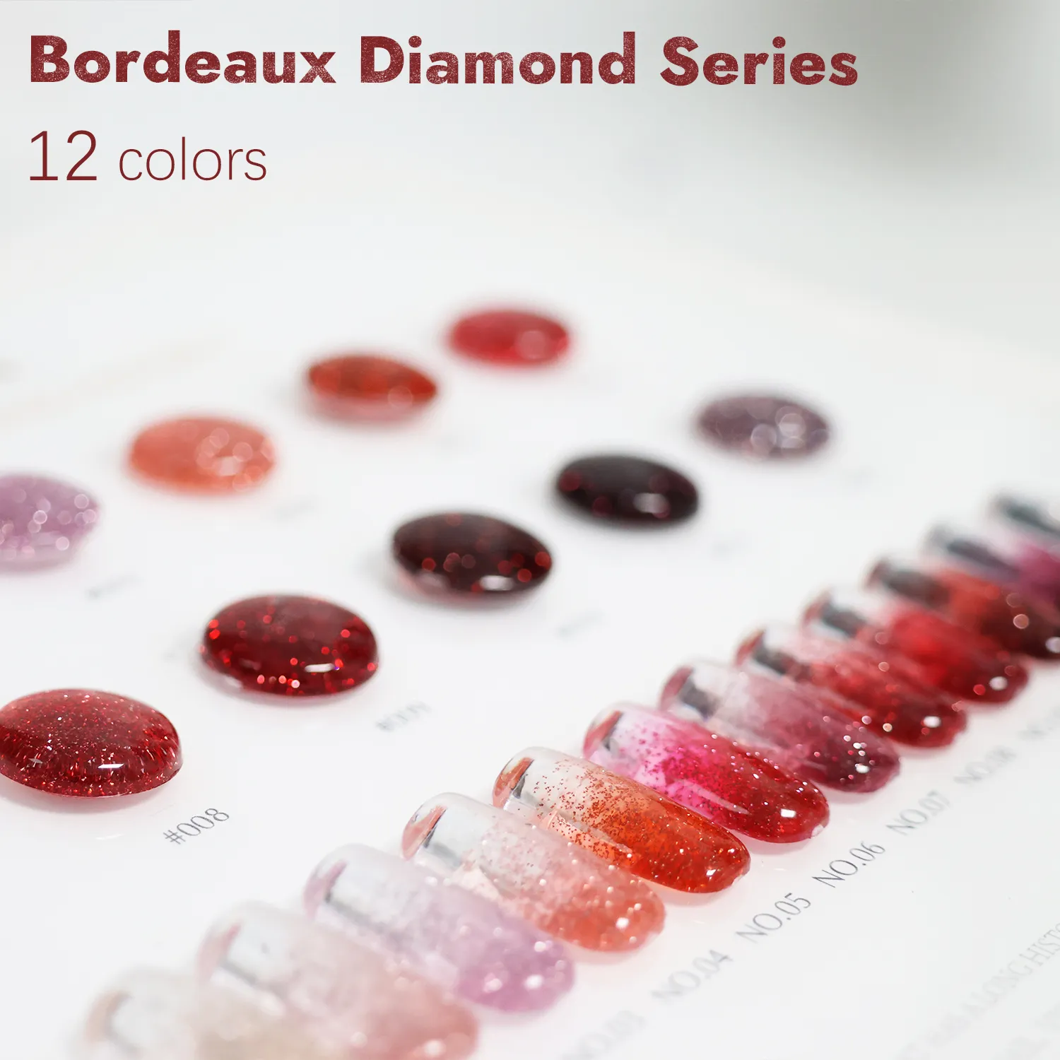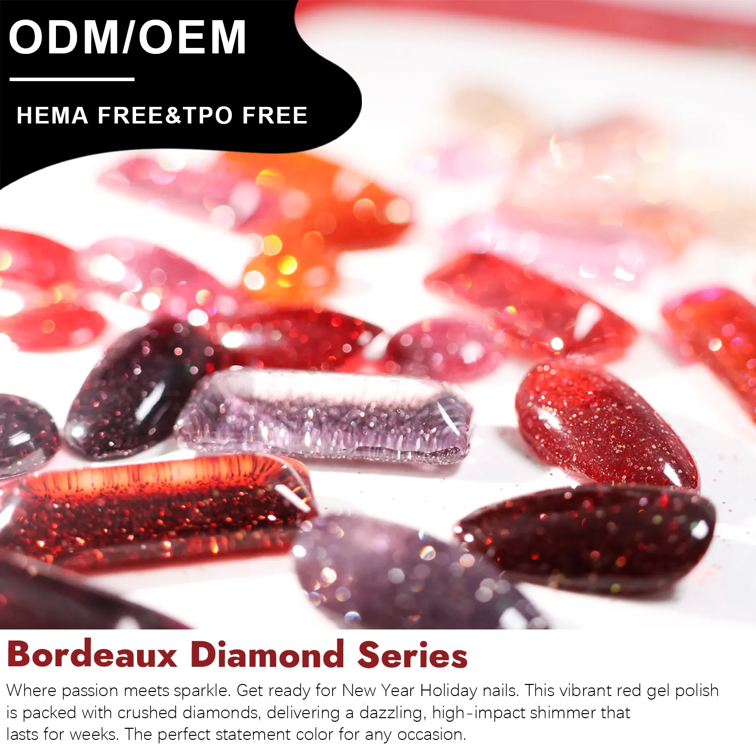 Welcome to purchase, bordeaux diamond gel polish wholesale with 12 colors, TPO-free formula, factory-direct price advantages, and free samples. Perfect for nail salons and private label brands, offering stable quality, rich shine, and fast delivery.